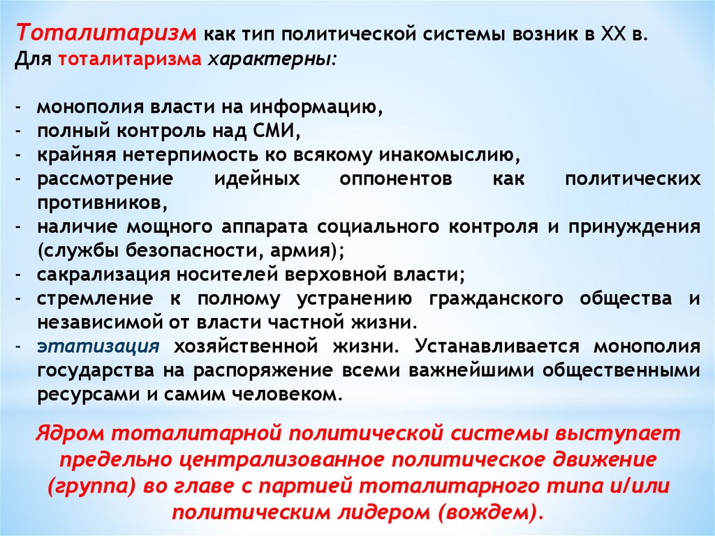 Тоталитаризм как тип политической системы возник в ХХ в.Для тоталитаризма характерны: