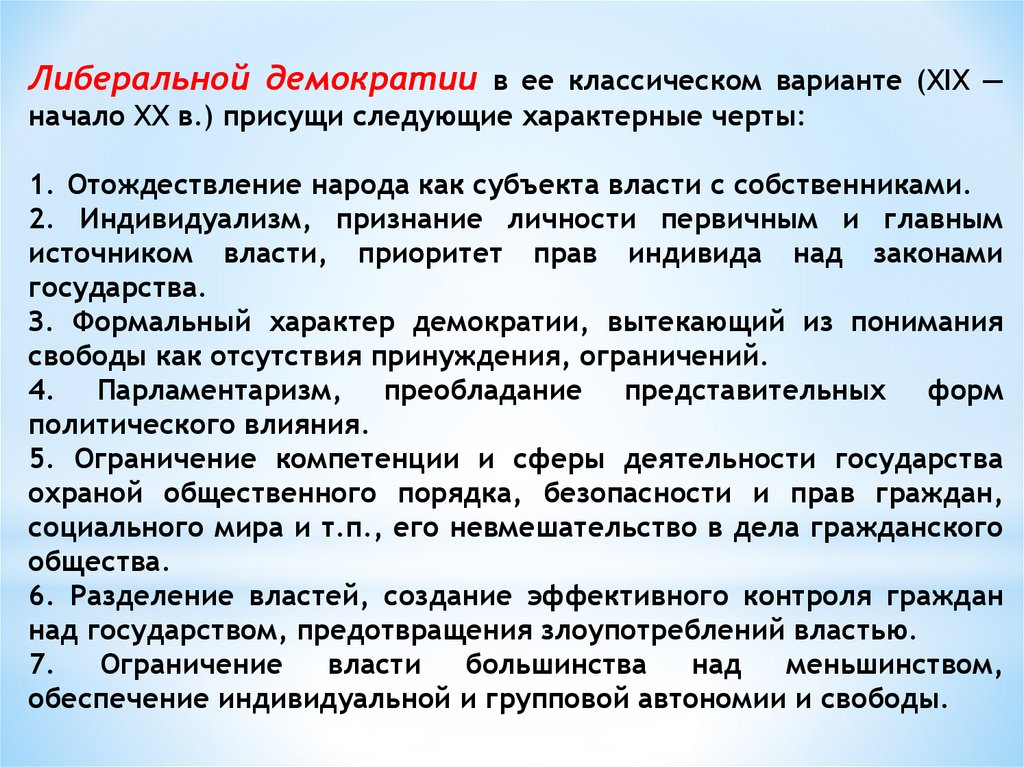 Либеральной демократии в ее классическом варианте (ХIХ —начало ХХ в.) присущи следующие характерные черты: