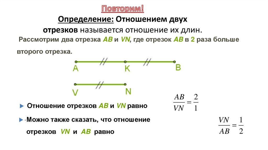 Рассмотрим два отрезка AB и VN, где отрезок AB в 2 раза больше
