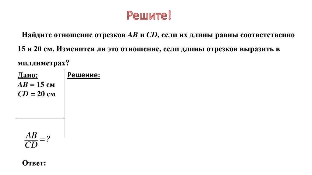 Найдите отношение отрезков AB и CD, если их длины равны соответственно15 и 20 см. Изменится ли это отношение, если длины отрезков выразить в