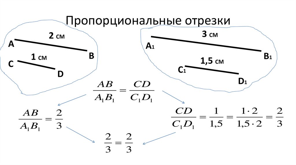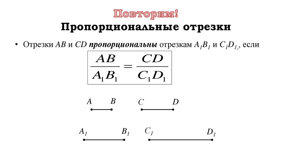 Пропорциональные отрезки• Отрезки AB и CD пропорциональны отрезкам A1B1 и C1D1,, если