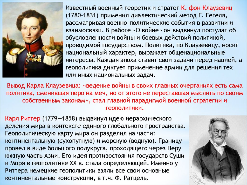 Известный военный теоретик и стратег К. фон Клаузевиц(1780-1831) применил диалектический метод Г. Гегеля,