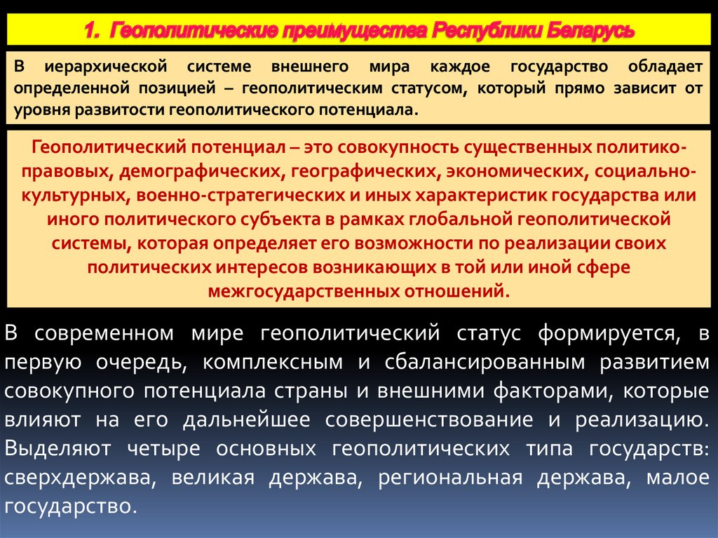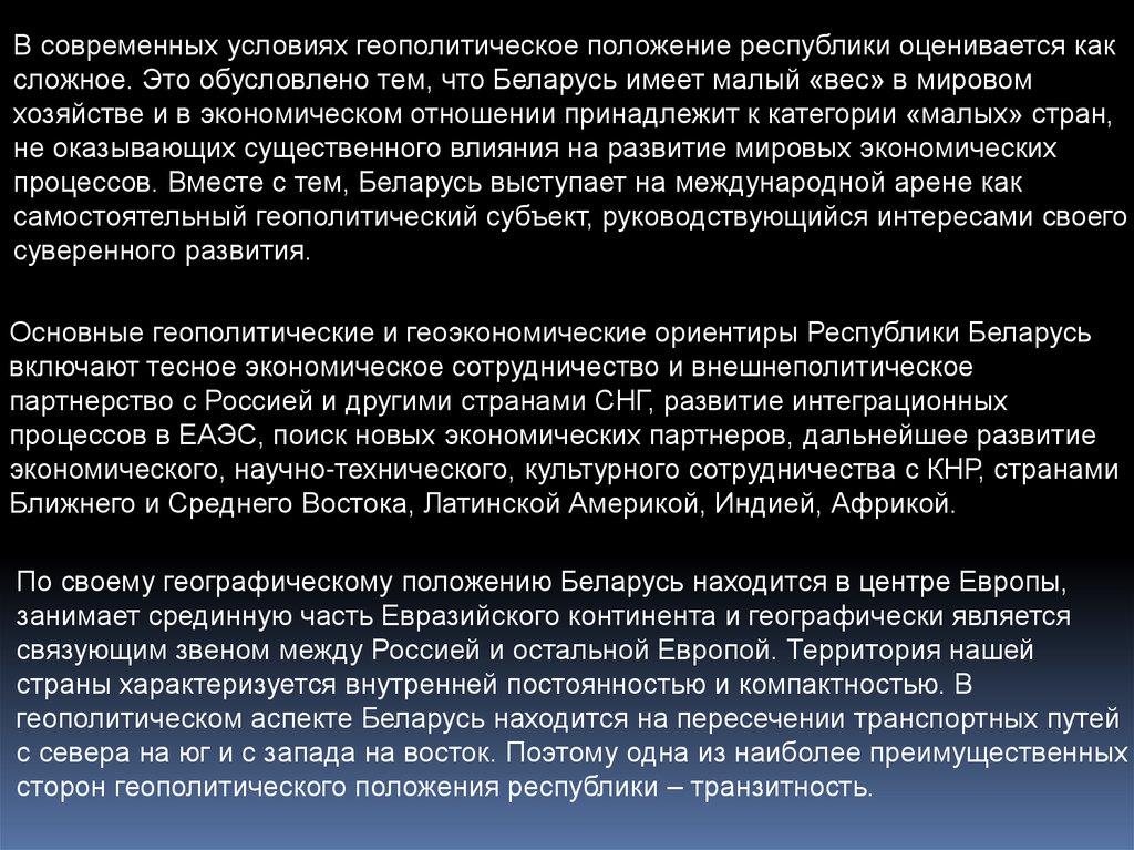 В современных условиях геополитическое положение республики оценивается каксложное. Это обусловлено тем, что Беларусь имеет малый «вес» в мировом