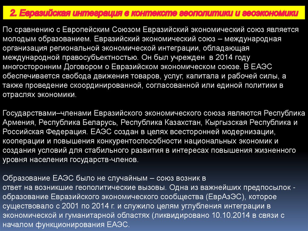 ответ на возникшие геополитические вызовы. Одна из важнейших предпосылок образование Евразийского экономического сообщества (ЕврАзЭС), которое