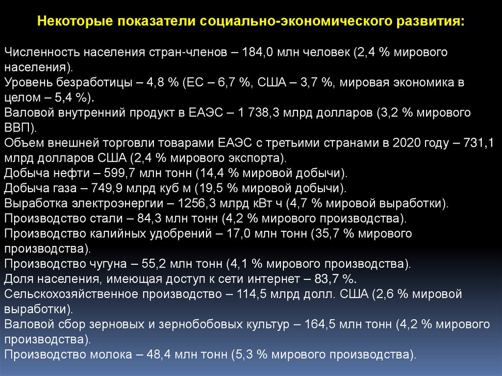 Некоторые показатели социально-экономического развития:Численность населения стран-членов – 184,0 млн человек (2,4 % мирового