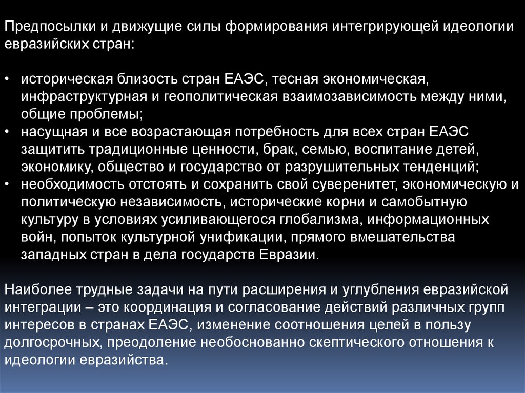 Предпосылки и движущие силы формирования интегрирующей идеологииевразийских стран: