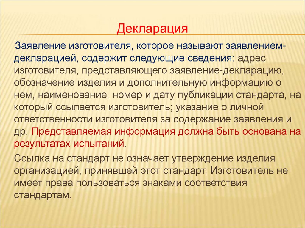 ДекларацияЗаявление изготовителя, которое называют заявлениемдекларацией, содержит следующие сведения: адрес