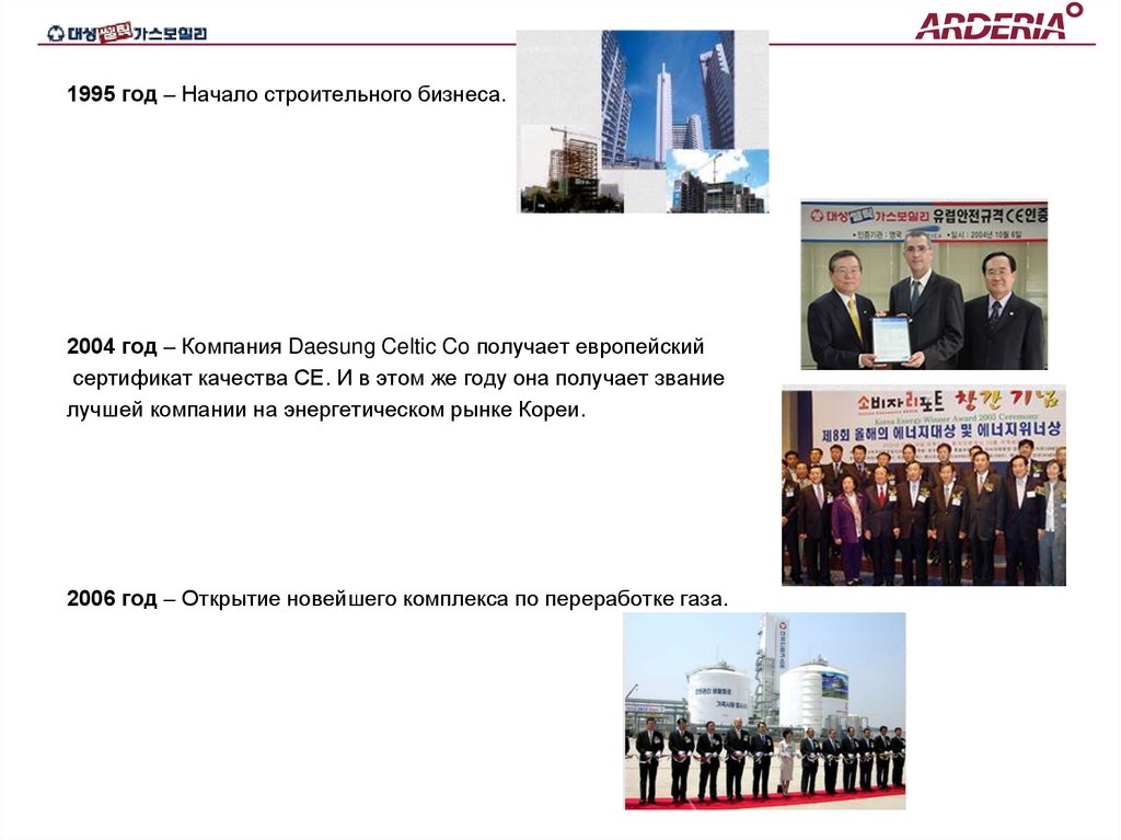 1995 год – Начало строительного бизнеса.2004 год – Компания Daesung Celtic Co получает европейский