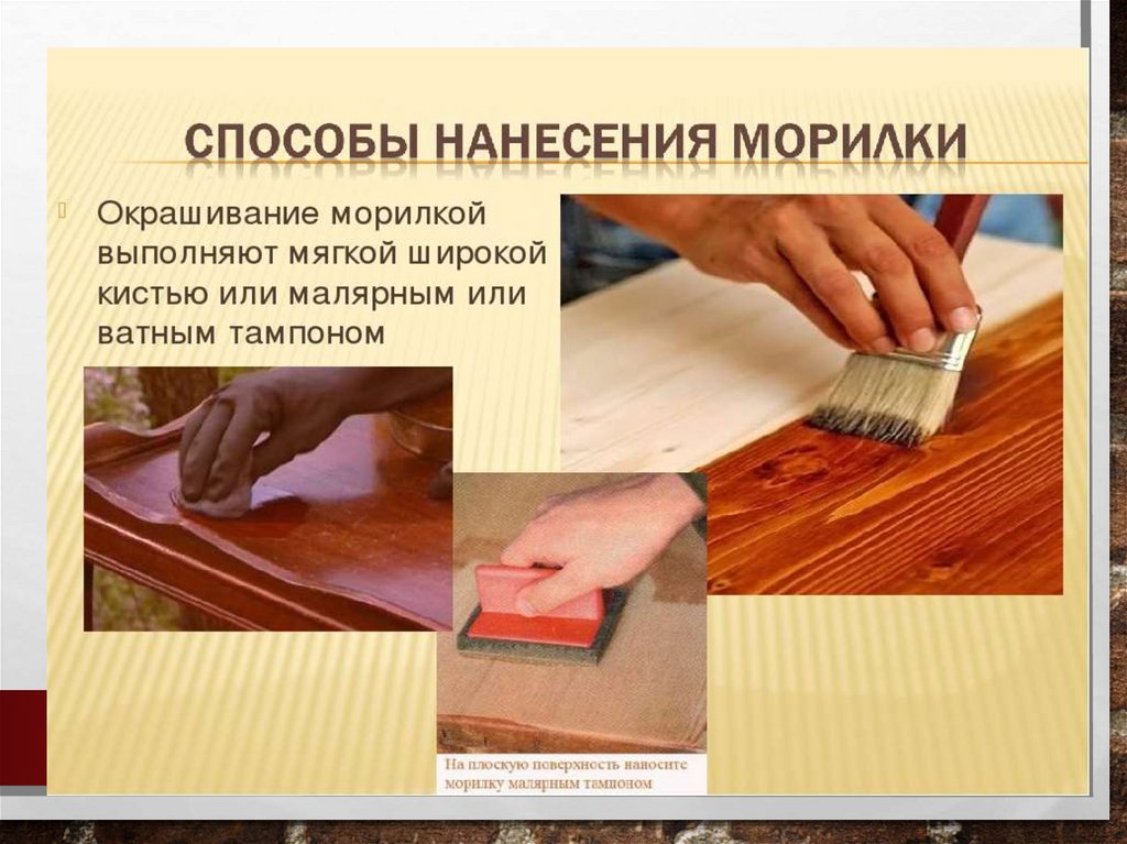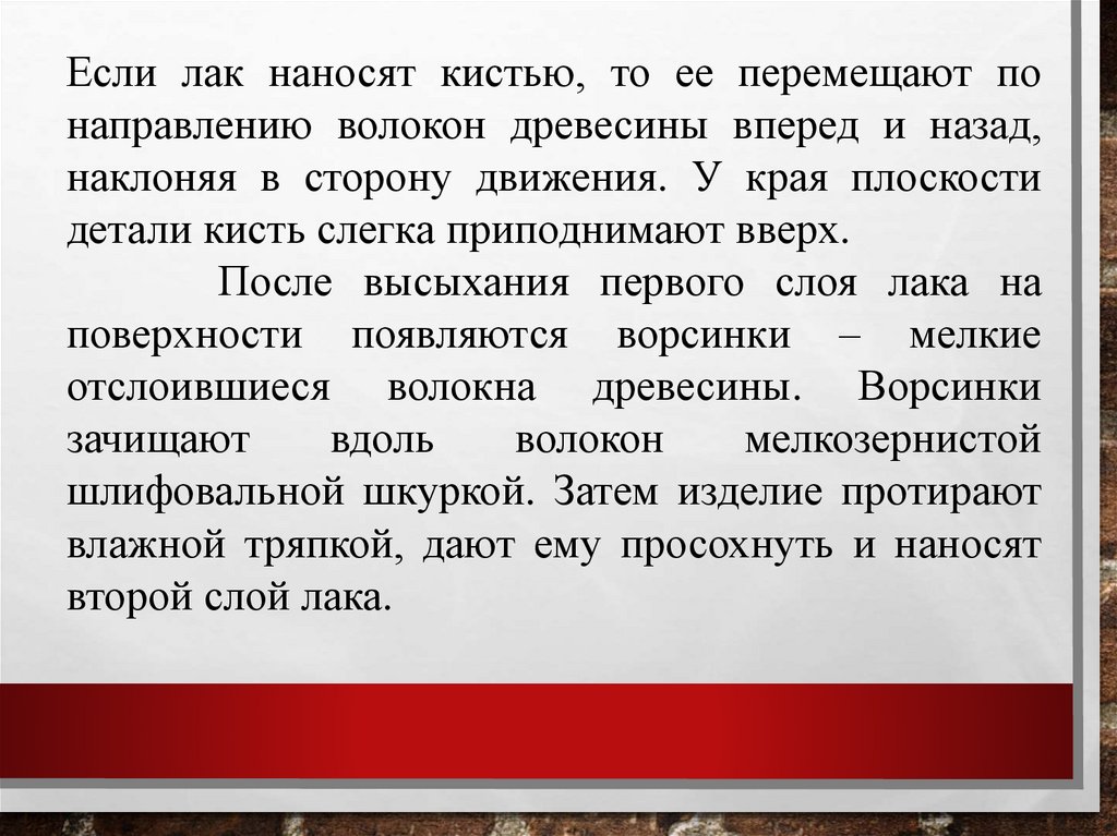 Если лак наносят кистью, то ее перемещают понаправлению волокон древесины вперед и назад,