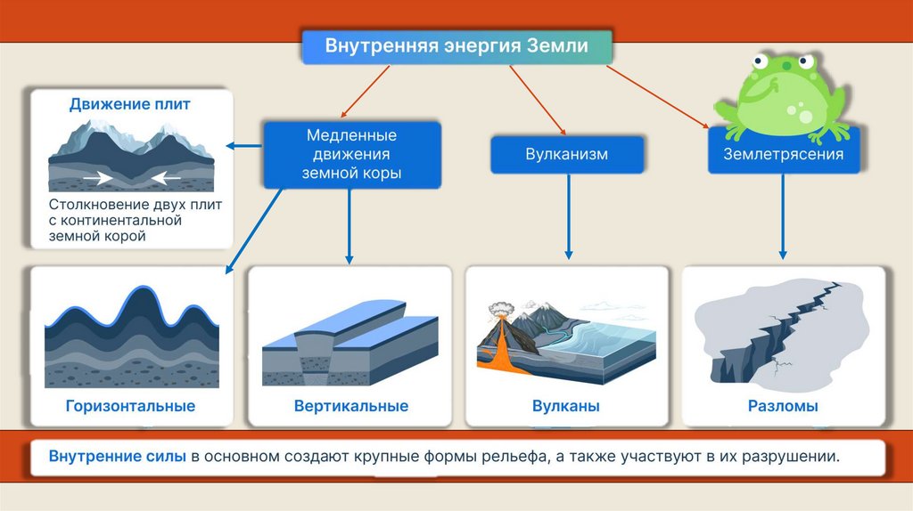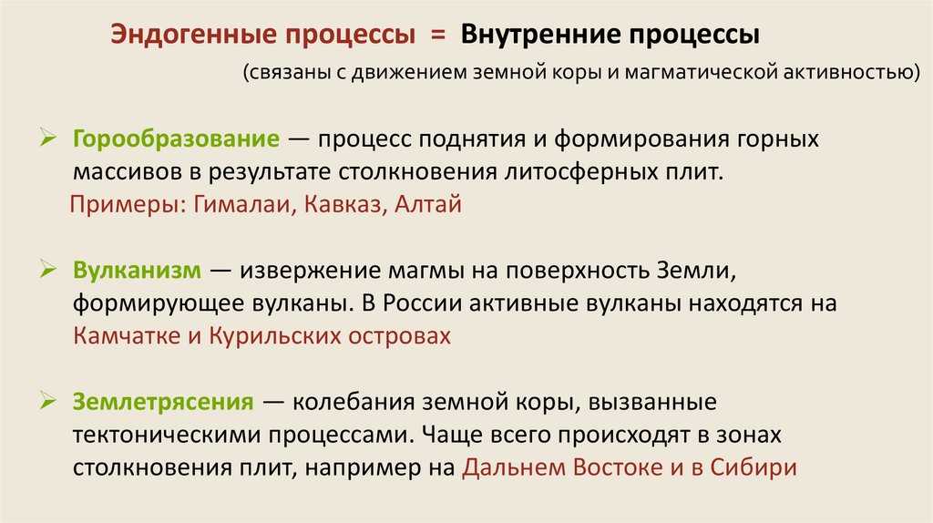 Эндогенные процессы = Внутренние процессы(связаны с движением земной коры и магматической активностью)