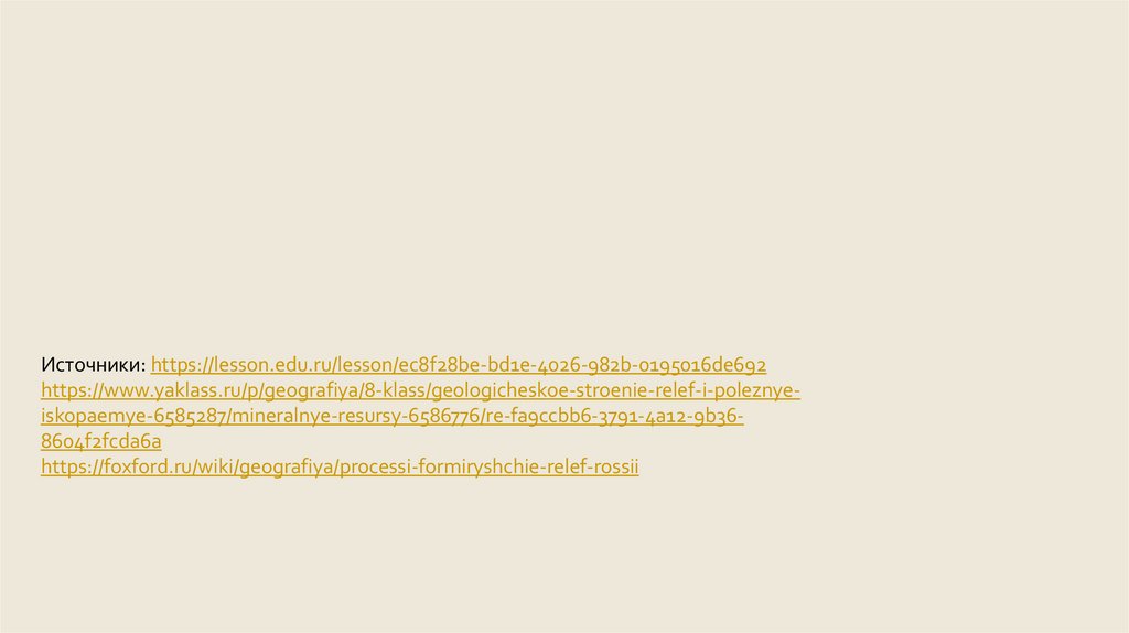 Источники: https://lesson.edu.ru/lesson/ec8f28be-bd1e-4026-982b-0195016de692https://www.yaklass.ru/p/geografiya/8-klass/geologicheskoe-stroenie-relef-i-poleznyeiskopaemye-6585287/mineralnye-resursy-6586776/re-fa9ccbb6-3791-4a12-9b368604f2fcda6a