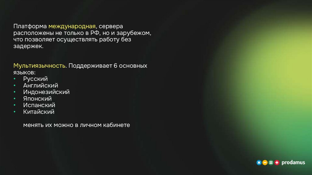 Платформа международная, серверарасположены не только в РФ, но и зарубежом,