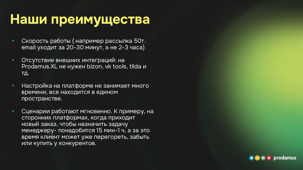 Наши преимуществаСкорость работы ( например рассылка 50т.