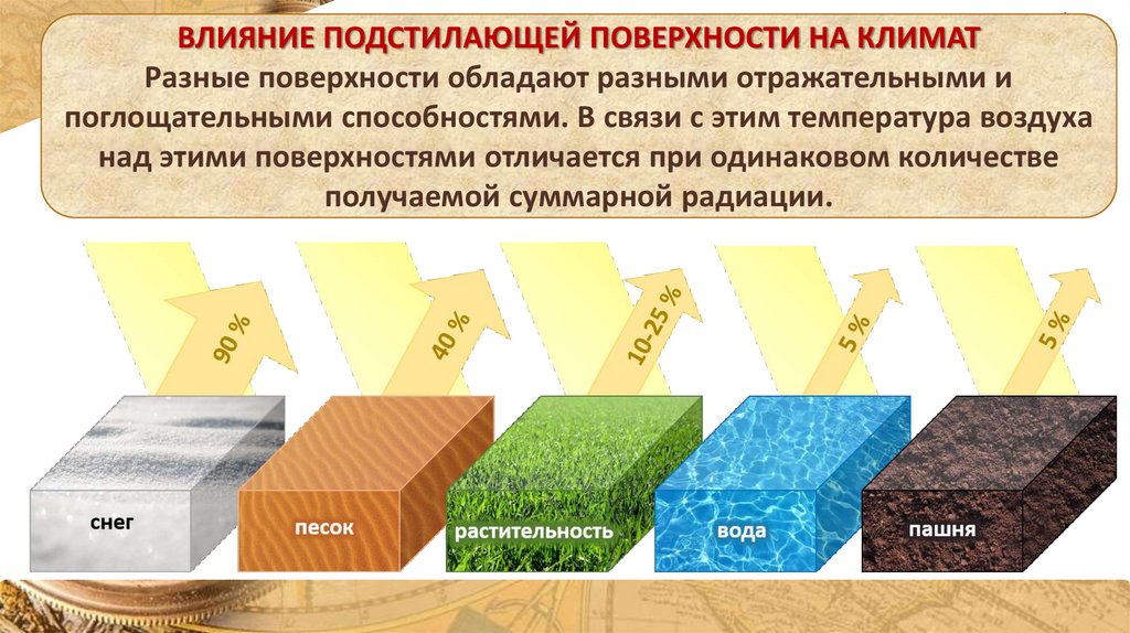 ВЛИЯНИЕ ПОДСТИЛАЮЩЕЙ ПОВЕРХНОСТИ НА КЛИМАТРазные поверхности обладают разными отражательными и