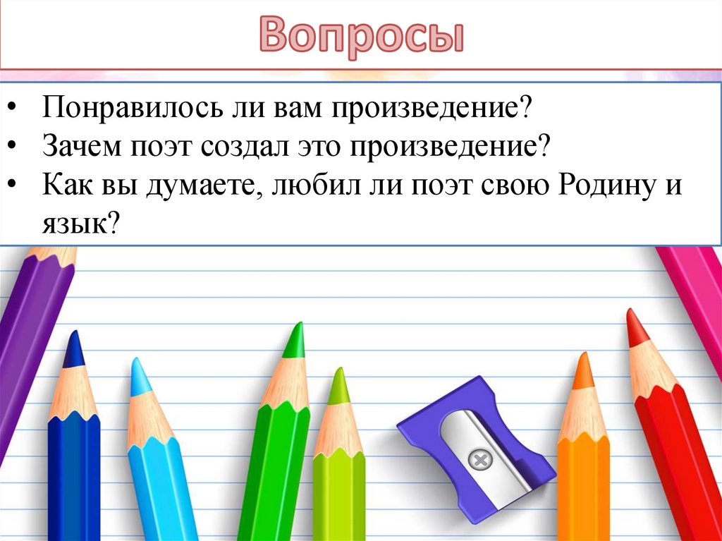 • Понравилось ли вам произведение?• Зачем поэт создал это произведение?