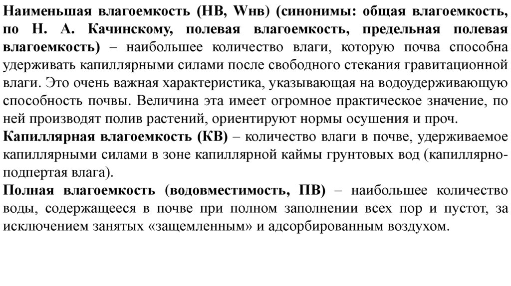 Наименьшая влагоемкость (НВ, Wнв) (синонимы: общая влагоемкость,по Н. А. Качинскому, полевая влагоемкость, предельная полевая