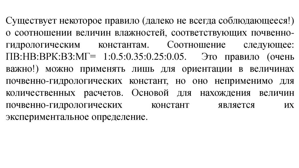 Существует некоторое правило (далеко не всегда соблюдающееся!)о соотношении величин влажностей, соответствующих почвенногидрологическим