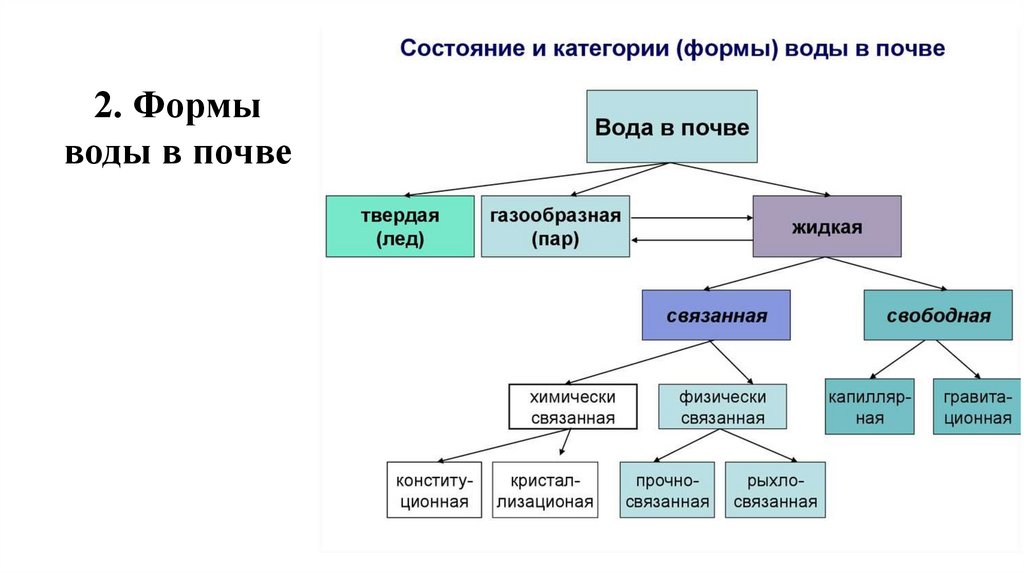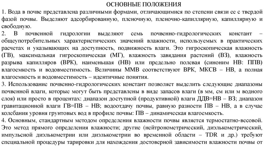 ОСНОВНЫЕ ПОЛОЖЕНИЯ1. Вода в почве представлена различными формами, отличающимися по степени связи ее с твердой