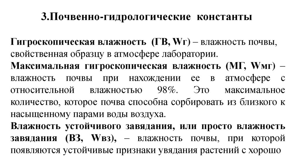 3.Почвенно-гидрологические константыГигроскопическая влажность (ГВ, Wг) – влажность почвы,