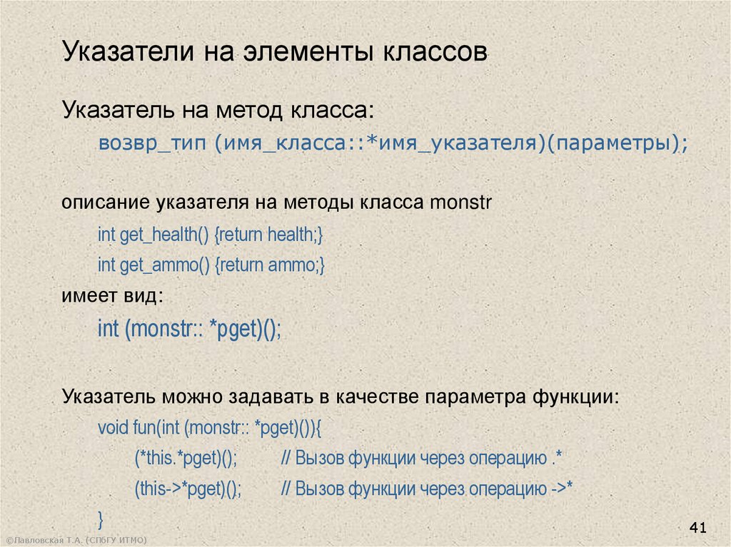 Указатели на элементы классовУказатель на метод класса: