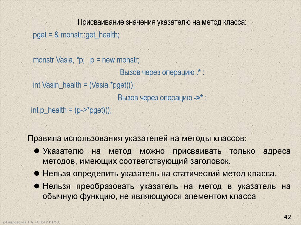 Присваивание значения указателю на метод класса:pget = & monstr::get_health;