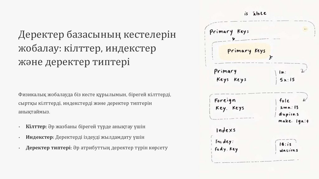 Физикалық жобалауда біз кесте құрылымын, бірегей кілттерді,