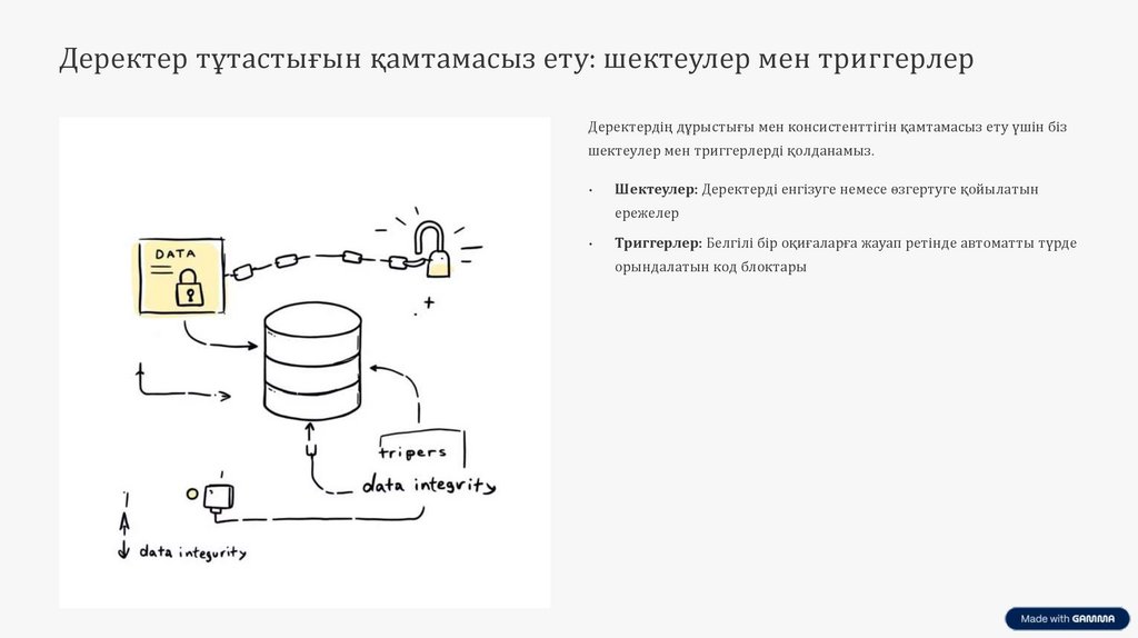 Деректер тұтастығын қамтамасыз ету: шектеулер мен триггерлерДеректердің дұрыстығы мен консистенттігін қамтамасыз ету үшін біз
