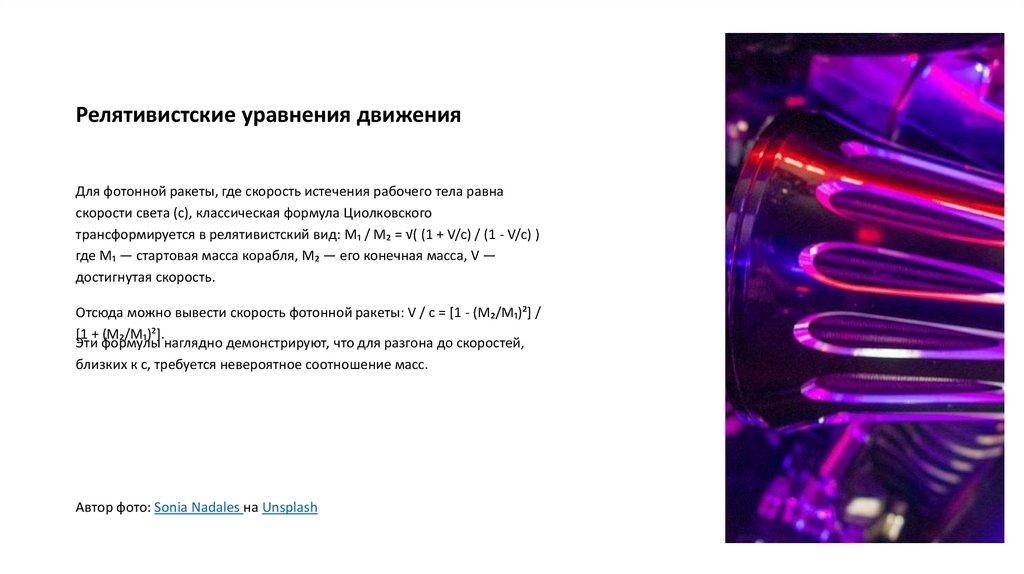 Отсюда можно вывести скорость фотонной ракеты: V / c = [1 - (M₂/M₁)²] /