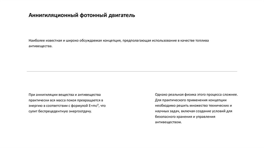 Аннигиляционный фотонный двигательНаиболее известная и широко обсуждаемая концепция, предполагающая использование в качестве топлива