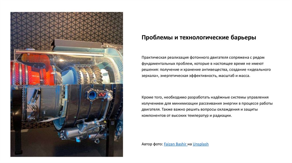 Проблемы и технологические барьерыПрактическая реализация фотонного двигателя сопряжена с рядом