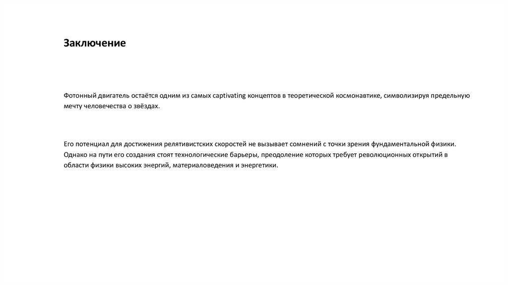 ЗаключениеФотонный двигатель остаётся одним из самых captivating концептов в теоретической космонавтике, символизируя предельную