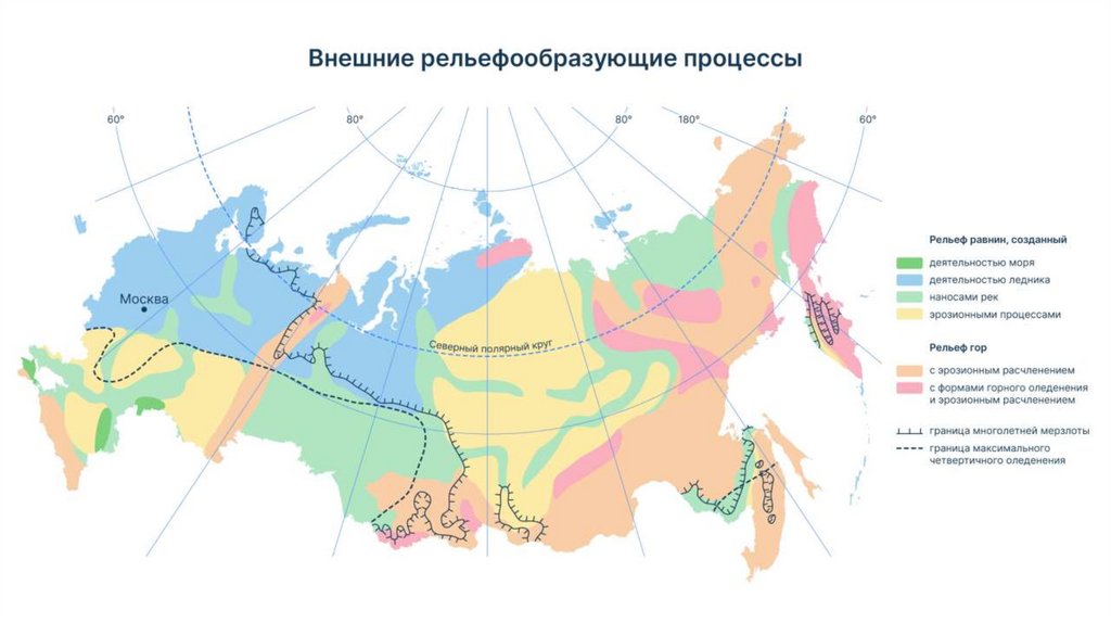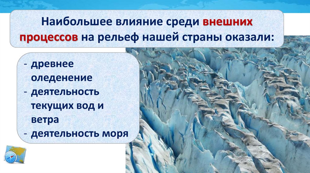 Наибольшее влияние среди внешнихпроцессов на рельеф нашей страны оказали: