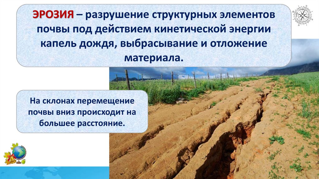 ЭРОЗИЯ – разрушение структурных элементовпочвы под действием кинетической энергии