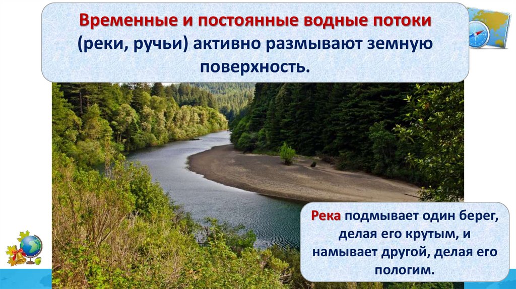 Временные и постоянные водные потоки(реки, ручьи) активно размывают земную