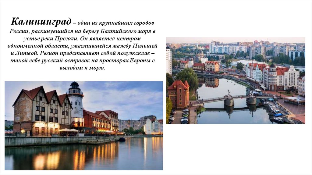 Калининград – один из крупнейших городовРоссии, раскинувшийся на берегу Балтийского моря в