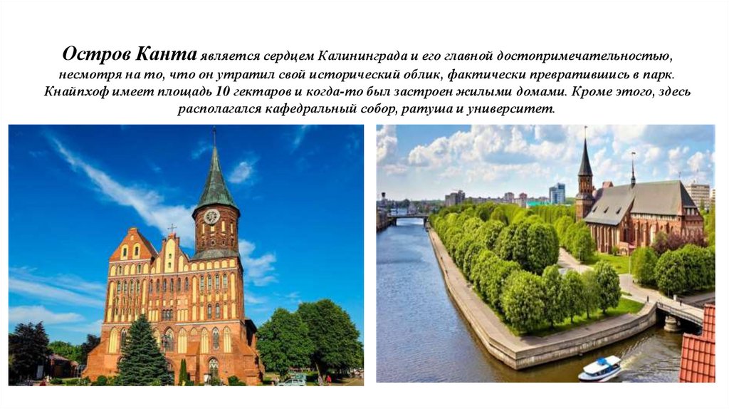 Остров Канта является сердцем Калининграда и его главной достопримечательностью,несмотря на то, что он утратил свой исторический облик, фактически превратившись в парк.