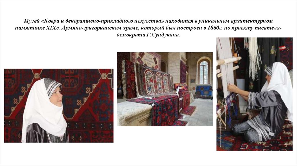 Музей «Ковра и декоративно-прикладного искусства» находится в уникальном архитектурномпамятнике XIXв. Армяно-григорианском храме, который был построен в 1860г. по проекту писателядемократа Г.Сундукяна.