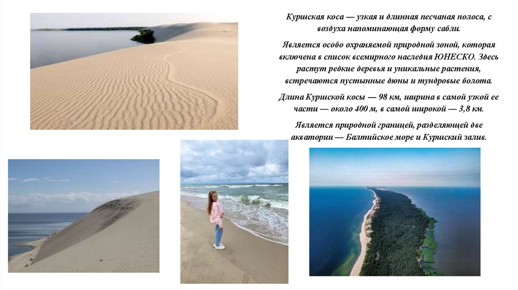 Куршская коса — узкая и длинная песчаная полоса, своздуха напоминающая форму сабли.