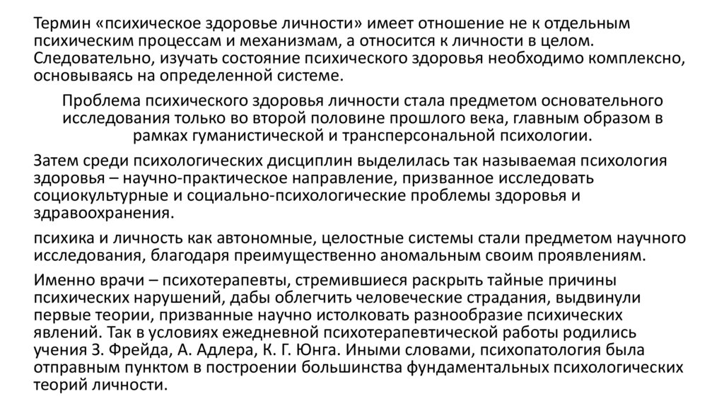 Термин «психическое здоровье личности» имеет отношение не к отдельнымпсихическим процессам и механизмам, а относится к личности в целом.