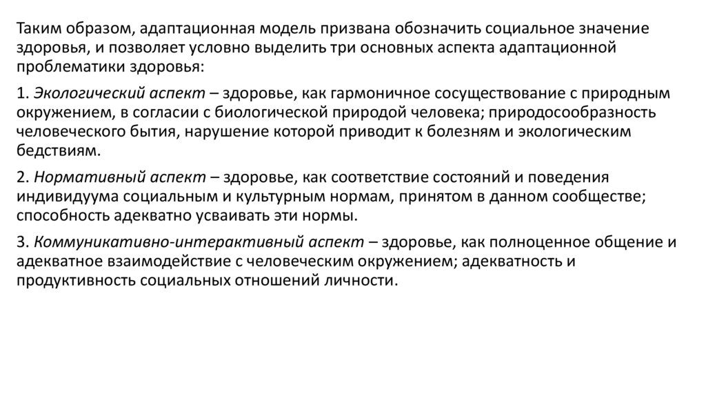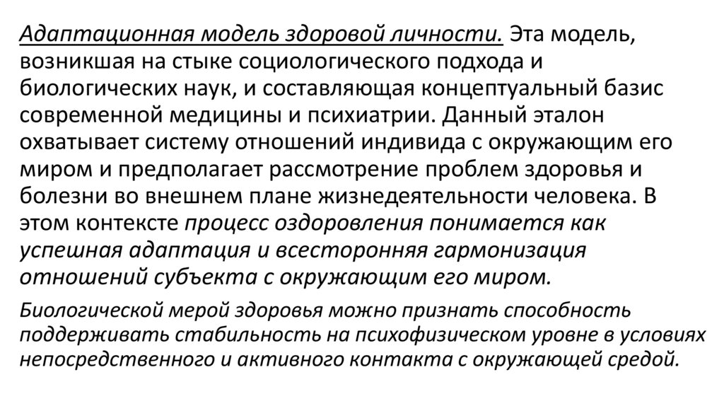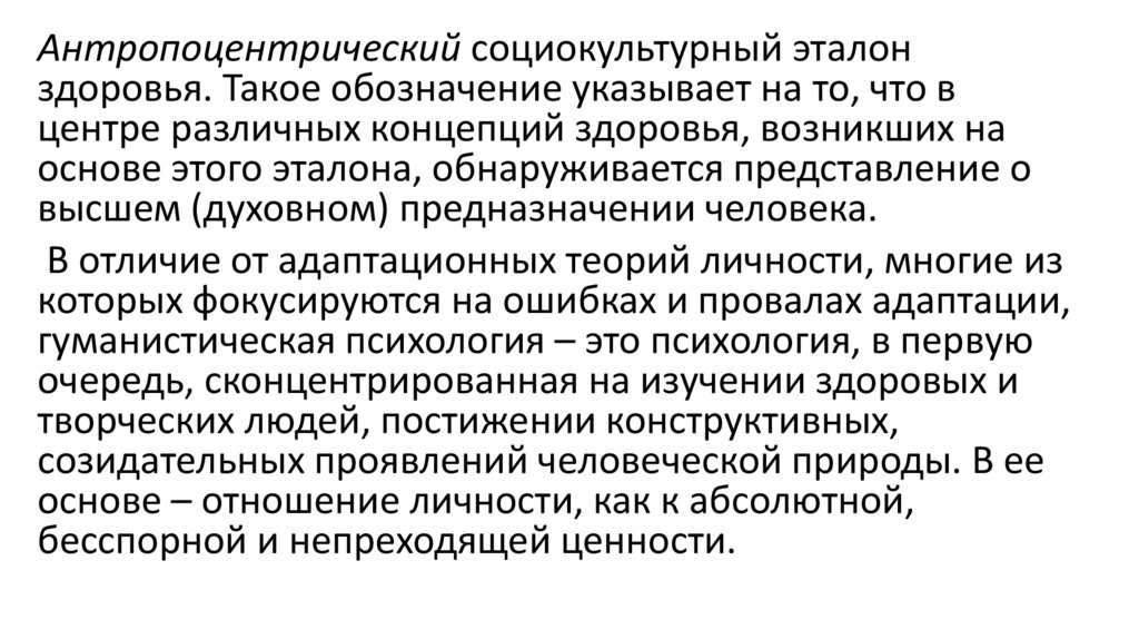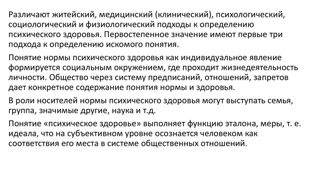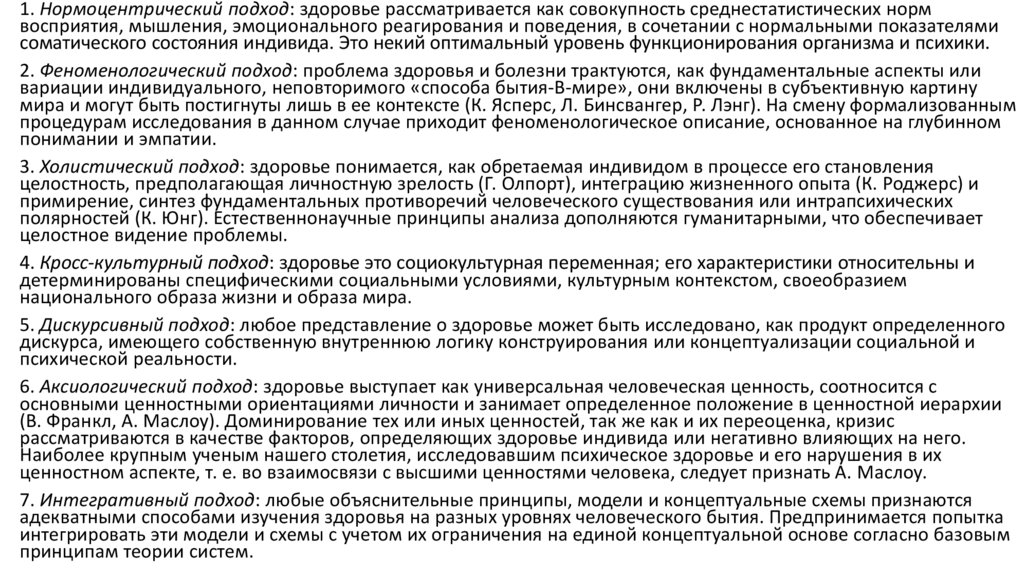 1. Нормоцентрический подход: здоровье рассматривается как совокупность среднестатистических нормвосприятия, мышления, эмоционального реагирования и поведения, в сочетании с нормальными показателями
