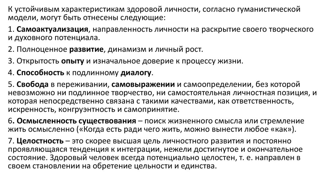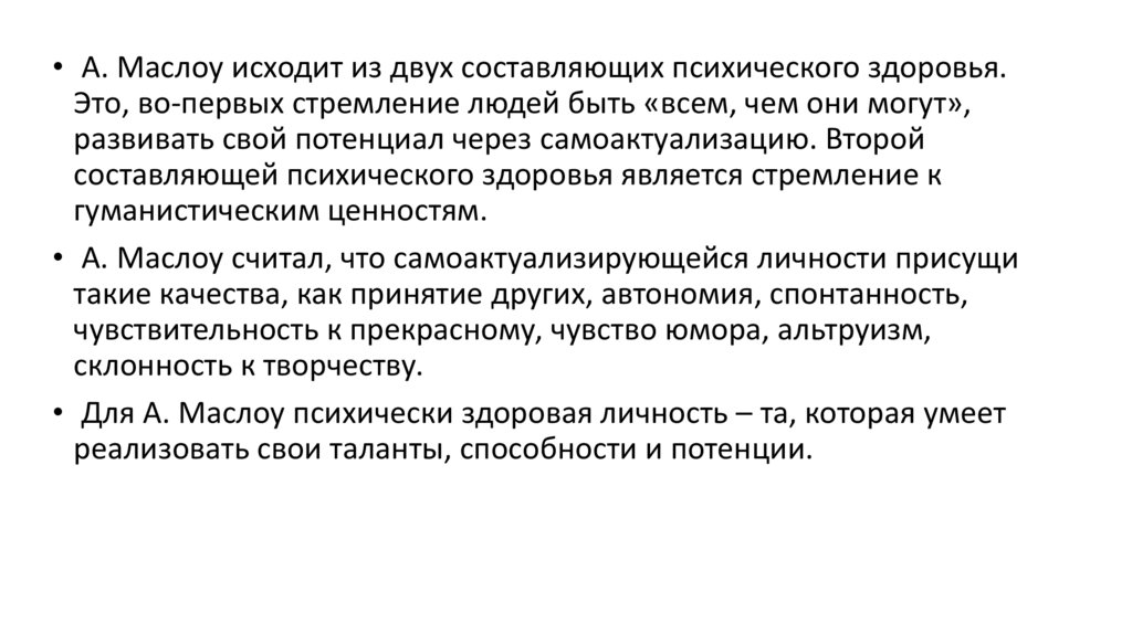 • А. Маслоу исходит из двух составляющих психического здоровья.Это, во-первых стремление людей быть «всем, чем они могут»,