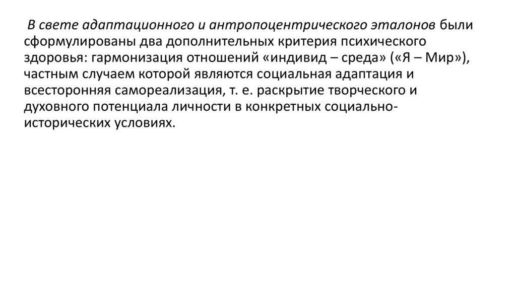 В свете адаптационного и антропоцентрического эталонов былисформулированы два дополнительных критерия психического