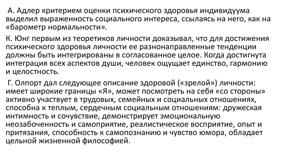 Г. Олпорт дал следующее описание здоровой («зрелой») личности: