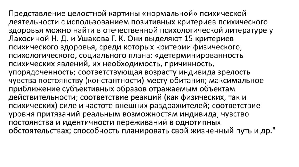 Представление целостной картины «нормальной» психическойдеятельности с использованием позитивных критериев психического