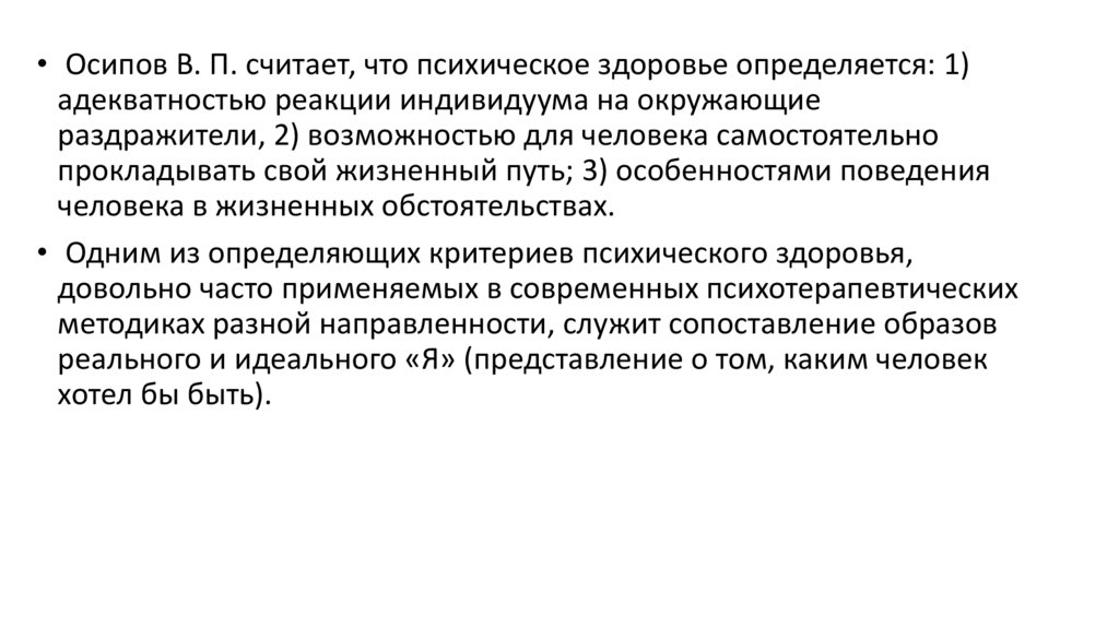 • Осипов В. П. считает, что психическое здоровье определяется: 1)адекватностью реакции индивидуума на окружающие