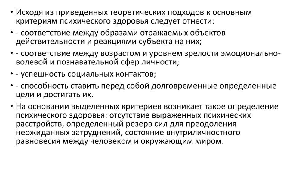 • Исходя из приведенных теоретических подходов к основнымкритериям психического здоровья следует отнести: