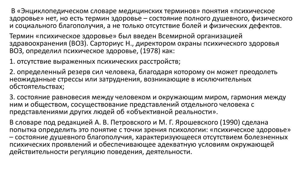 В «Энциклопедическом словаре медицинских терминов» понятия «психическоездоровье» нет, но есть термин здоровье – состояние полного душевного, физического