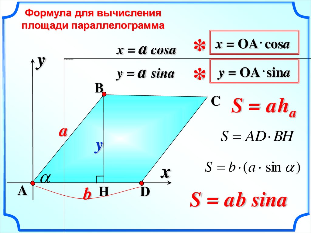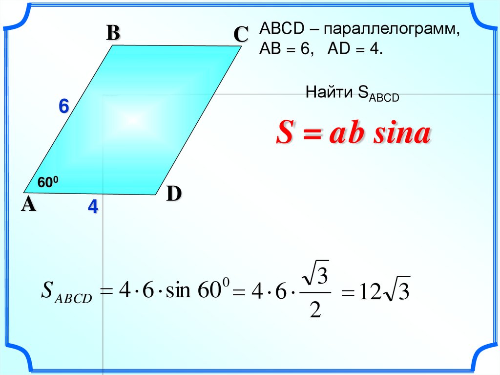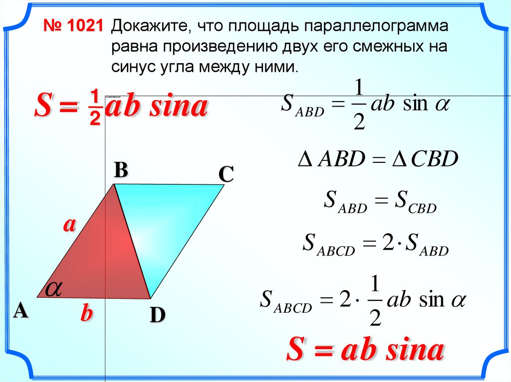 № 1021 Докажите, что площадь параллелограммаравна произведению двух его смежных на
