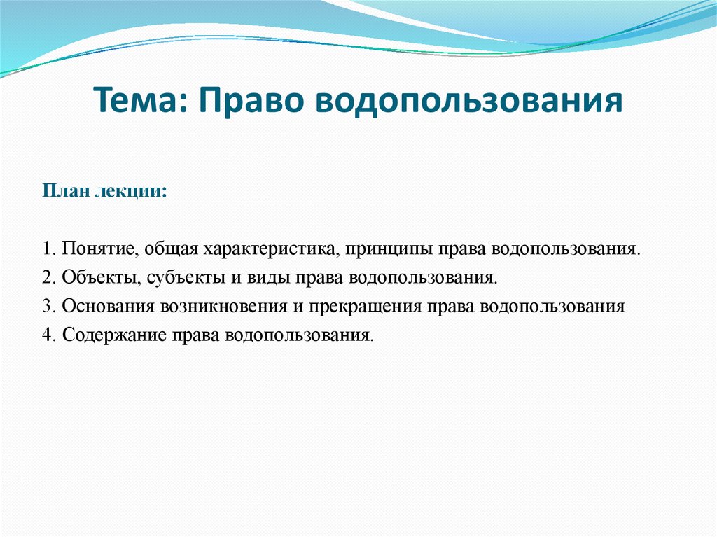 План лекции:1. Понятие, общая характеристика, принципы права водопользования.