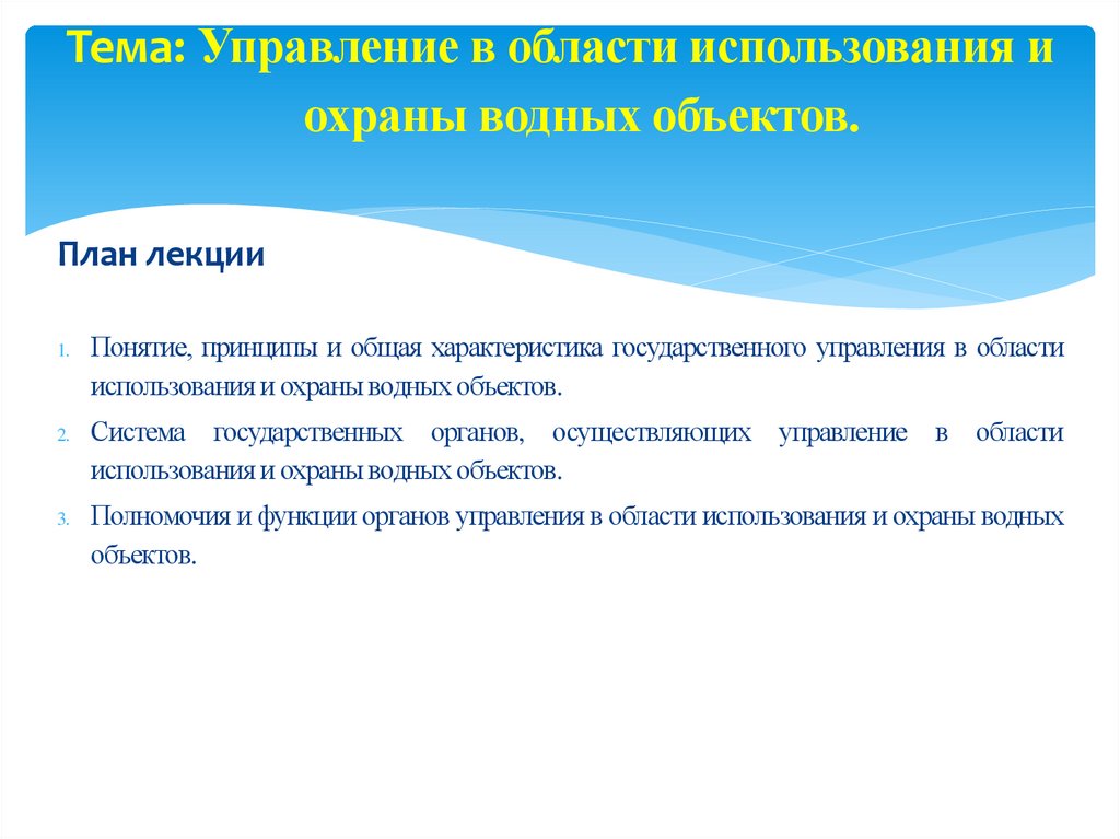 1. Тема: Управление в области использования и охраны водных объектов.
